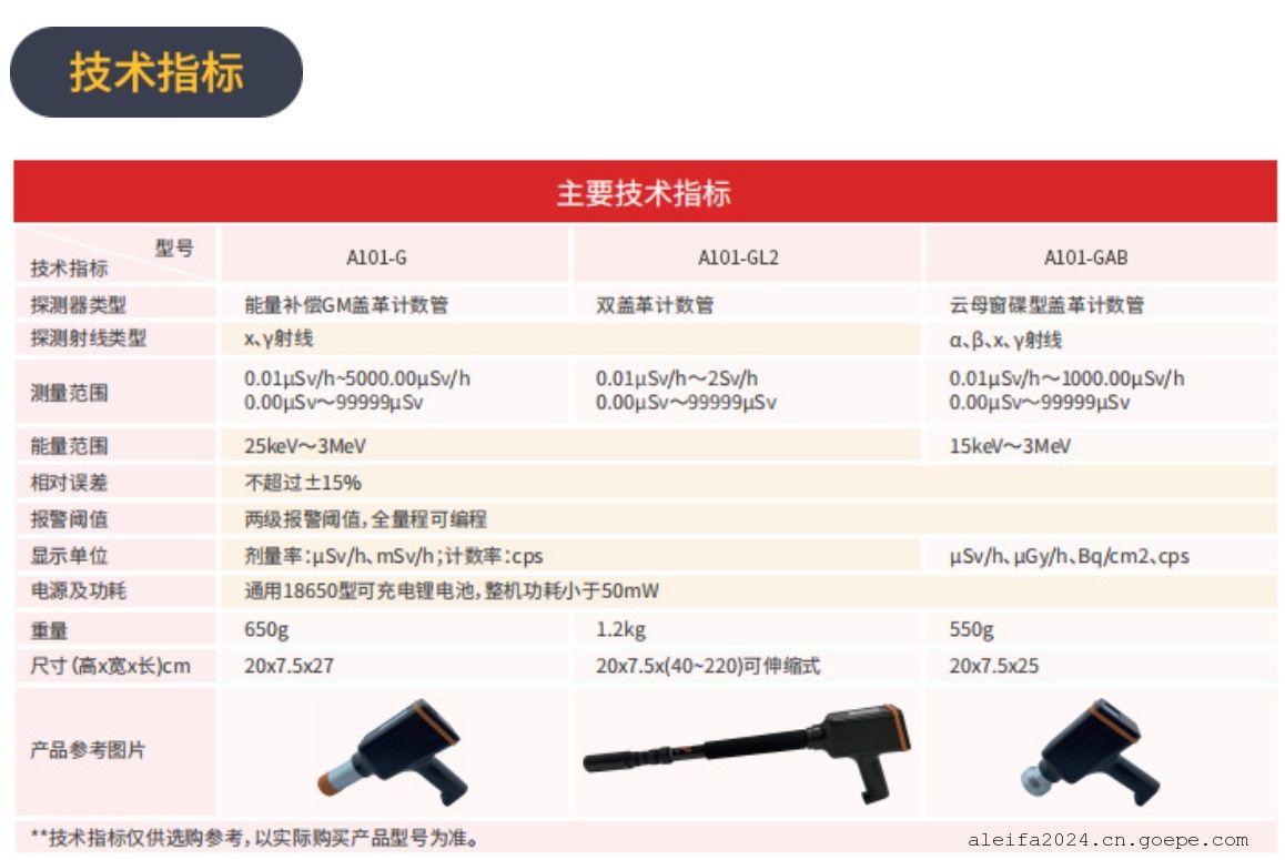品牌:阿镭法 型号:A101-G系列GAB型 (辐射巡检仪) 测量范围:0.01-5000μSv/h详技术参数 测量对象:х、γ辐射 测量精度:25KeV-3MeV详技术参数 产品简介