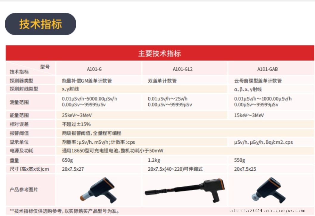 品牌:阿镭法 型号:A101-G系列GL2型(辐射巡检仪) 测量范围:0.01-5000μSv/h详技术参数 测量对象:х、γ辐射 测量精度:25KeV-3MeV详技术参数 产品简介